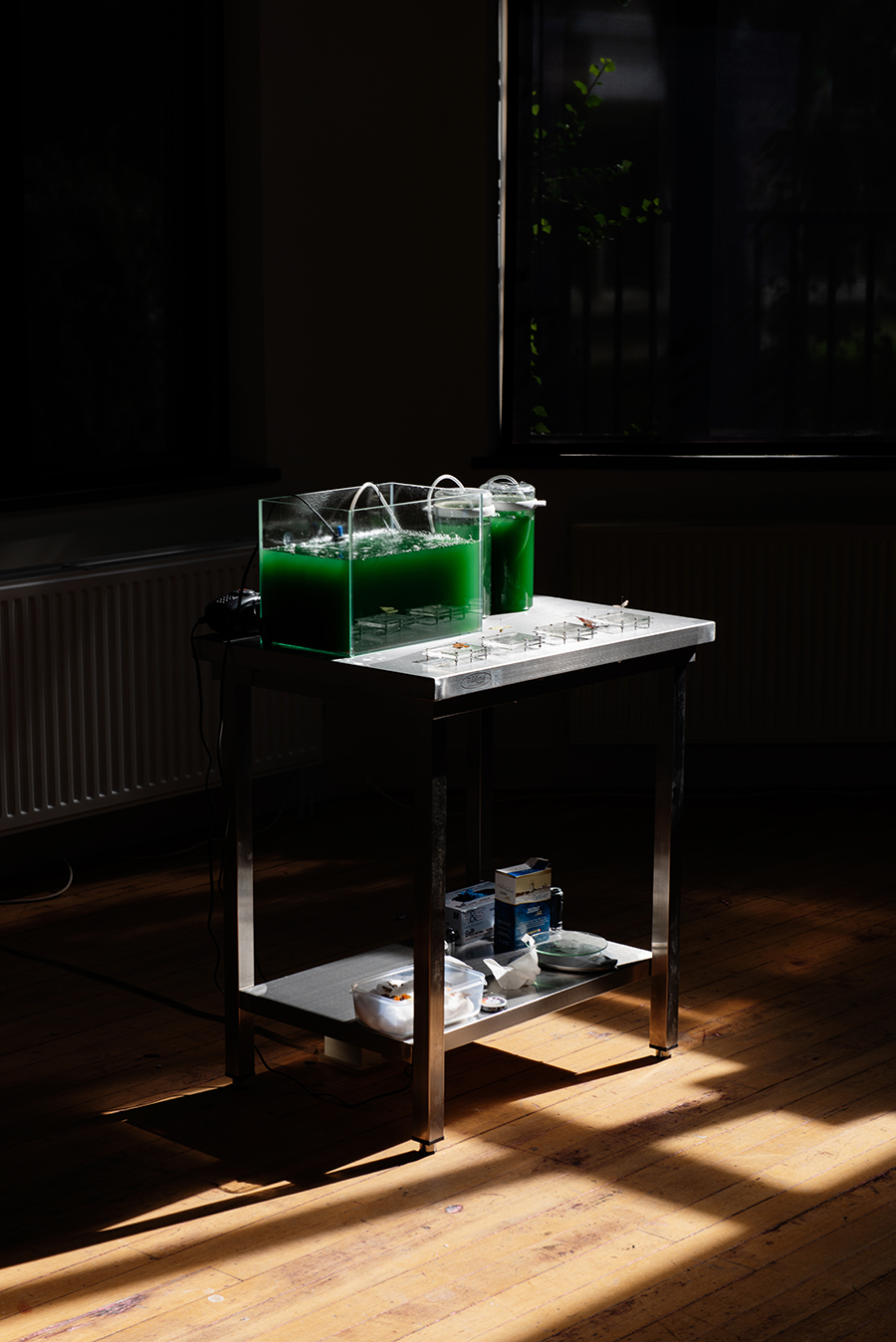 At the core of the installation, active Spirulina, a microorganism renowned for its vibrant green hue and nutritional value, takes center stage. Enclosed within a carefully crafted microfluidic system, the Spirulina thrives, representing the resilience of life in even the most controlled environments.